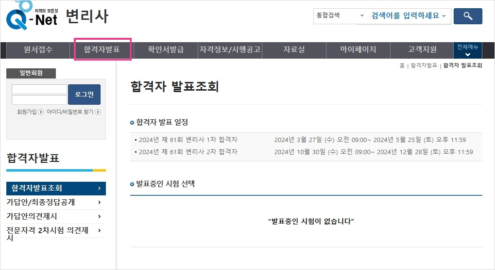 각 합격자 발표기간에 합격자 조회를 할 수 있습니다.