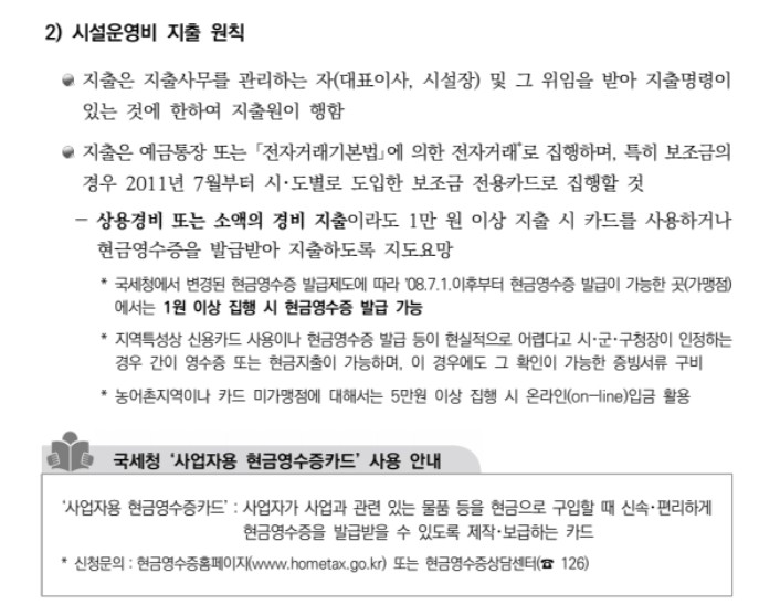 지출은 예금통장, 전자거래로 집행하며 보조금 전용카드로 집행하도록 하고 있습니다.