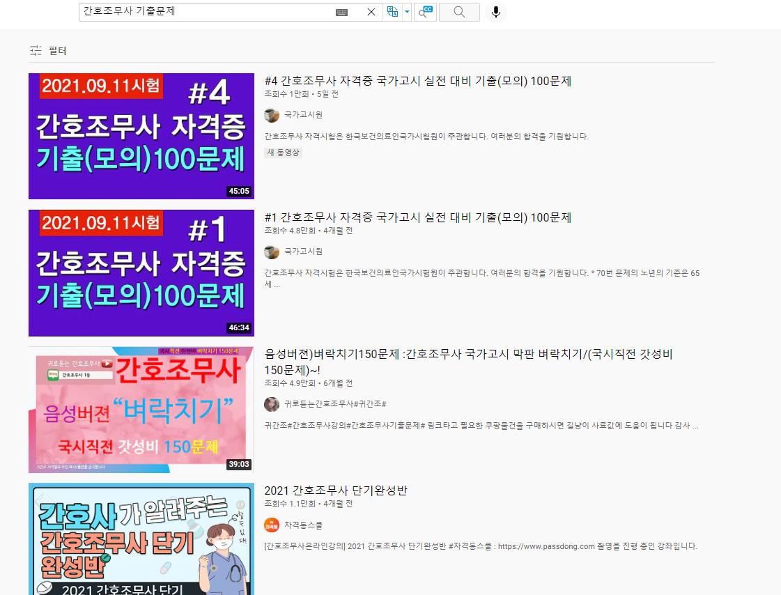 위 처럼 유튜브에서 간호조무사 시험문제를 검색하면 동영상으로 강의가 올라와있기도 합니다.