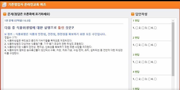 휴게음식점 위생교육 온라인교육(한국 휴게음식점중앙회 교육원 시험 정답)