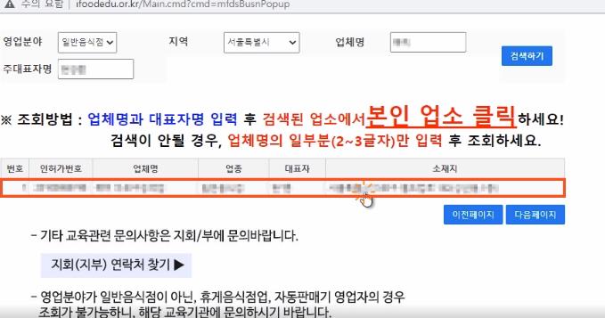 일반음식점이 아닌 휴게음식점,자동판매기 영업자는 조회가 불가능하니 해당 교육기관에 문의 해야합니다.