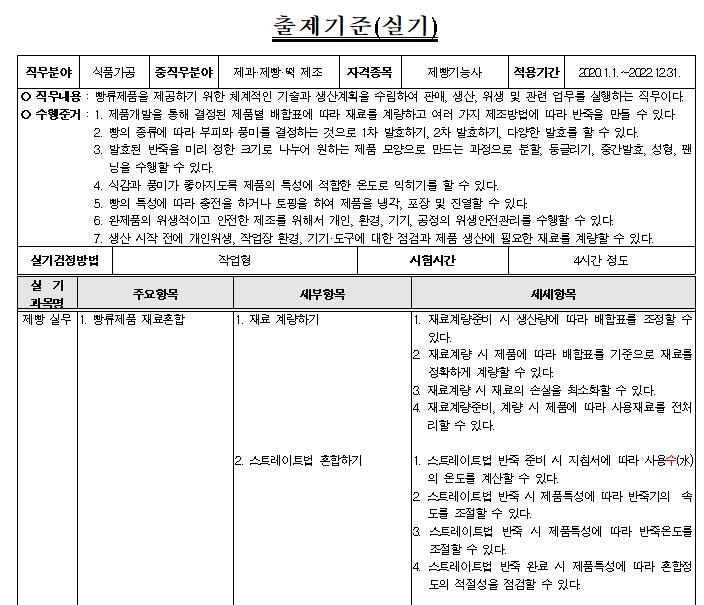 주로 제빵계랑과 반죽,발효,굽기,성형 등 공정을 거쳐 제빵작품을 만드는 작업을 수행하는걸 평가하는 시험입니다.