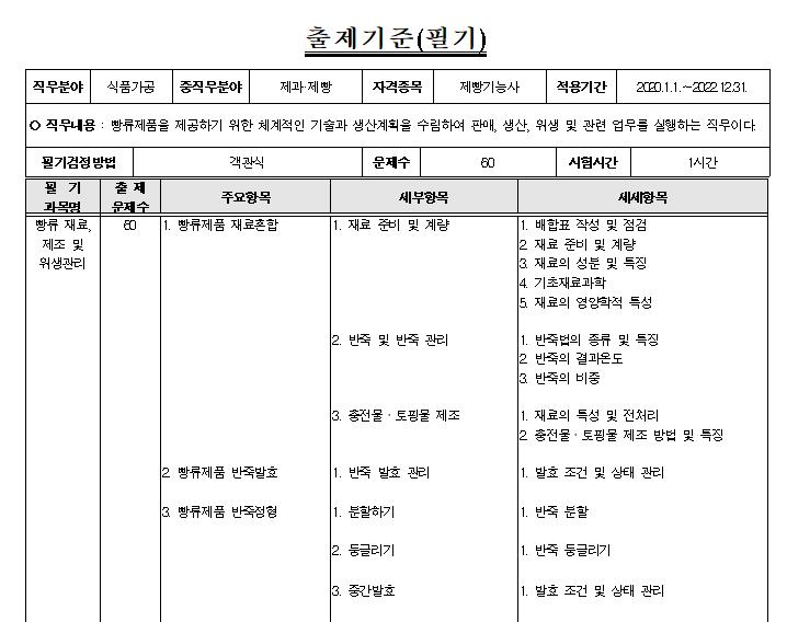 필기시험은 수수료가 14500으로 빵류재료와 제조 및 위생관리에 관한 과목을 치며 객관식으로 출제됩니다. 필기는 60문항을 60분동안 풀어야 합니다.
