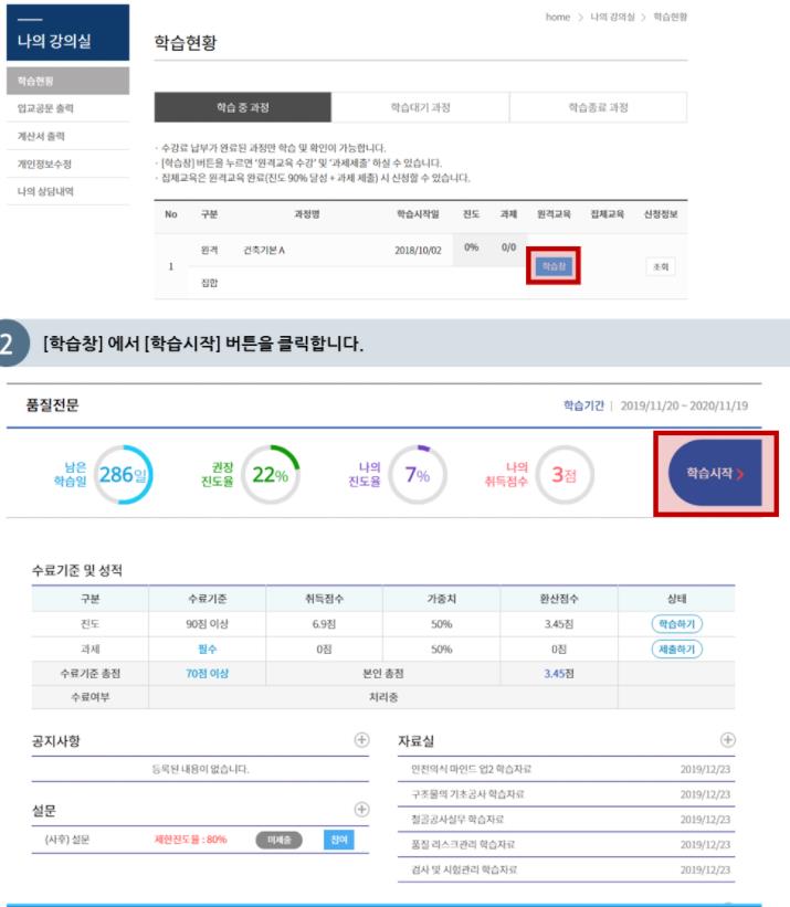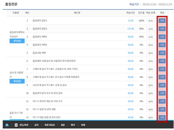 각 과목당 학습에서 학습시작을 클릭후 온라인교육을 시작합니다.
