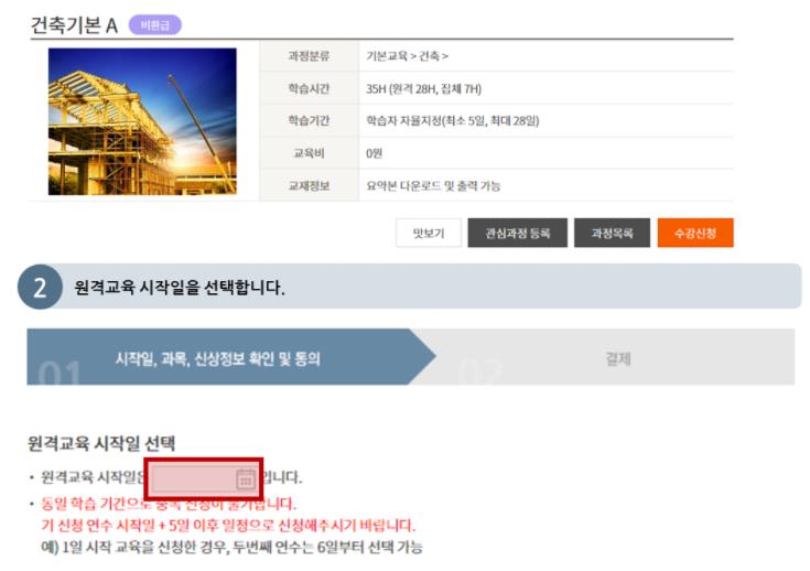수강신청을 선택한후 원격교육 시작일을 선택합니다.