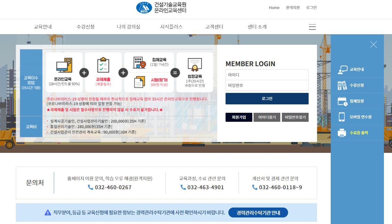 건설기술교육원 온라인교육센터는 건설기술교육원에서 시행하는 건설인들을 대상으로 하는 온라인 교육사이트입니다. 기술경쟁력을 갖춘 건설인들을 육성하기위해 다양한 교육을 받을수 있으며 건설기술진흥법등에 따라 의무적으로 이수해야하는 교육도 이 홈페이지에서 교육을 받을수 있습니다.
