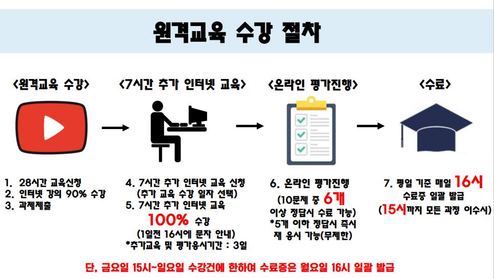 온라인교육 외에도 집체교육으로 별도로 오프라인교육을 시행했지만 최근 코로나19로 집체교육은 원격교육으로 대체되었습니다.추가인터넷교육 100%와 온라인평가응시 60점이상을 득점해야 수료가 완료됩니다.