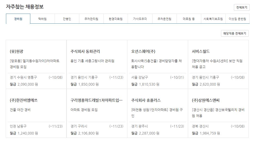 경비원,택배원,간병인,주차관리원,환경미화원,가사도우미,주차운전원,매표원,사회복지보조원,이삿짐 운반원등 다양한 직종 구인광고를 볼수 있습니다.