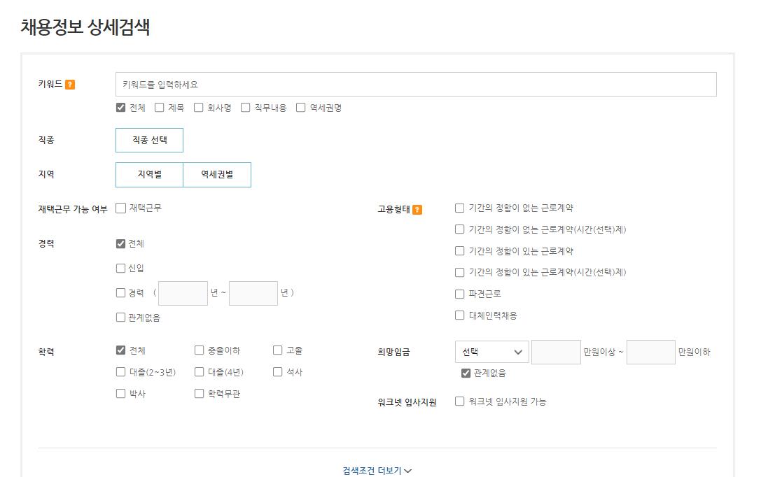 직종,지역,재택근무가능여부,경력,학력,고용형태,희망월급등 세부 내용을 선택해 검색하면 됩니다.