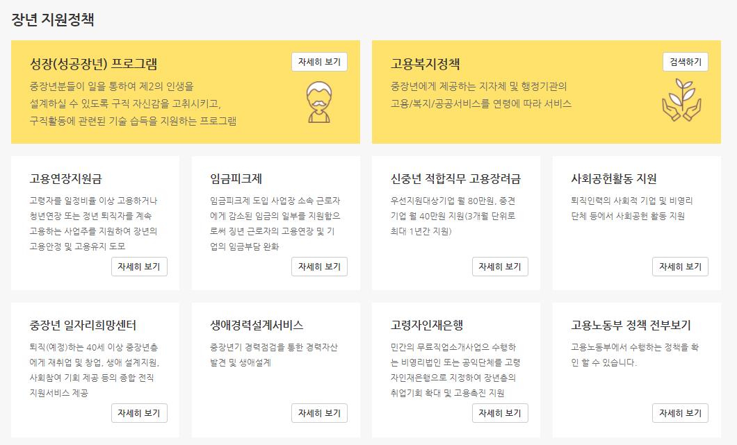 성장(성공장년)프로그램,고용복지정책,고용연장지원금,임금피크제,신중년 적합직무 고용장려금,사회공헌활동지원,고령자인재은행등 다양한 정부 정책을 확인하고 신청할수 있습니다.