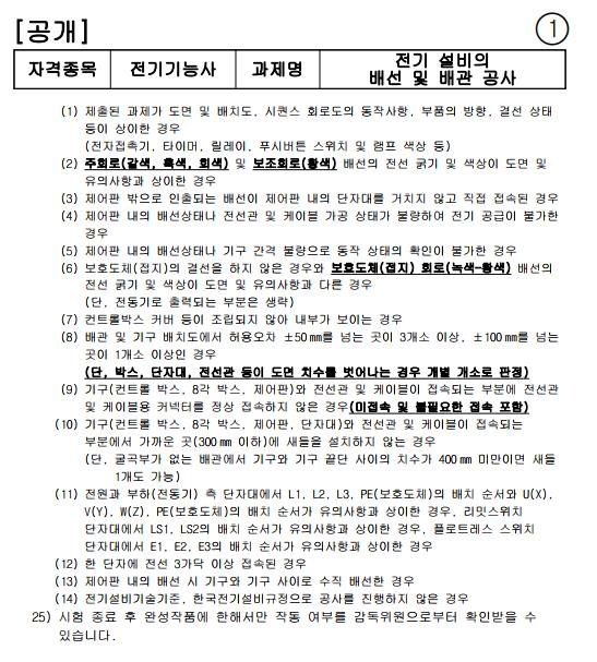주요 평가 항목은 전기공사 준비하기, 전기배관배선,전기기계기구설치,정동기제어 및 운용,전기시설물 검사 및 점검등을 보게 됩니다.
