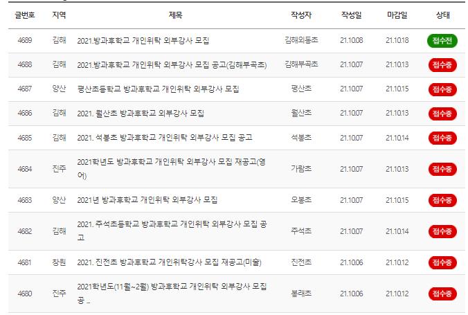 각 지자체 교육청에 접속하면 방과후 학교 돌봄교사를 구인하는 게시판이 있습니다.