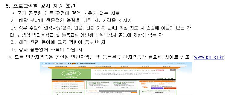 하나의 공를 보면 강사 지원조건에서 [해당 분야에 전문적인 능력을가지거나 자격증소지자]로 주로 구인광고에 조건이 있습니다.