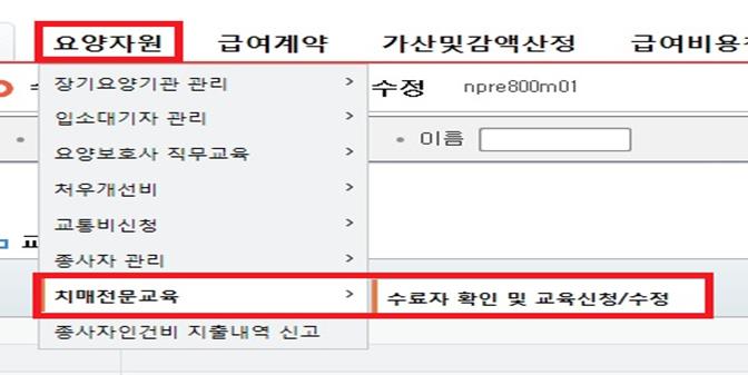 공인인증서나 공동인증서로 우선 로그인후-요양자원-치매전문교육-수료자 확인및 교육신청/수정으로 이동합니다.