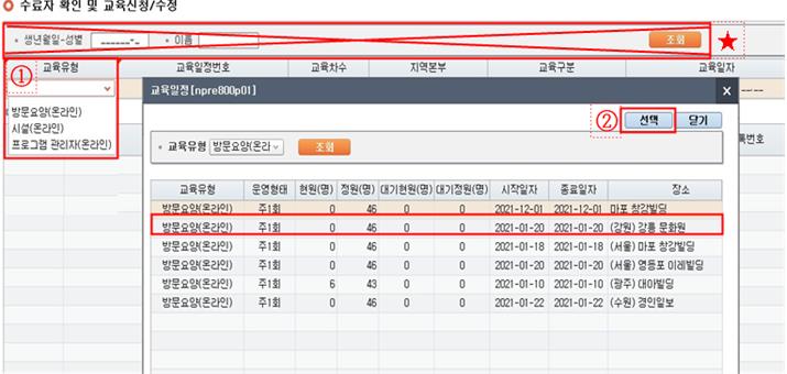 교육유형이 방문요양인지,시설인지,프로그램관리자 과정인지를 선택하면 교육일정이 뜹니다.