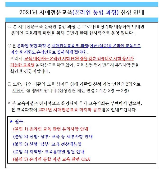 코로나19로인해 비대면 온라인 으로 치매전문교육과정 이론과 실습, 시험을 신청받고 실시하고 있습니다.
