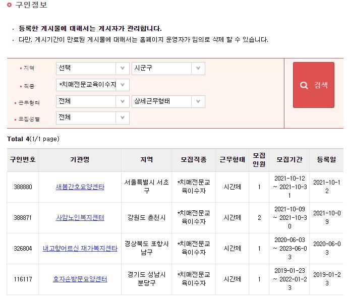 이렇게 치매전문교육과정을 이수후 건강보험공단홈페이지 구인정보에서 '치매전문교육이수자'직종을 선택하면 관련하여 구인공고가 올라와 지원을 할수 있게 됩니다.