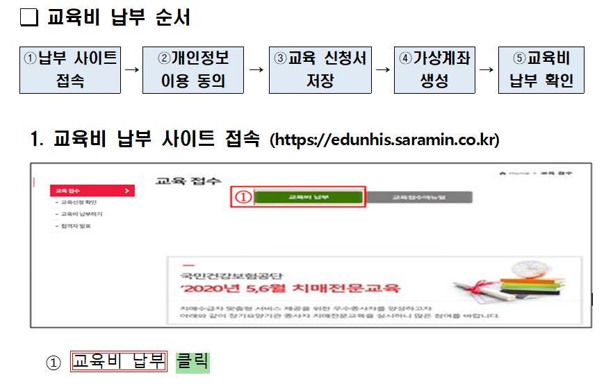 치매전문교육은 교육비 납부사이트(edunhis.saramin.co.kr)에 먼저 나부를 한후 치매전문교육 스마트e러닝에서 교육을 이수할수 있습니다.