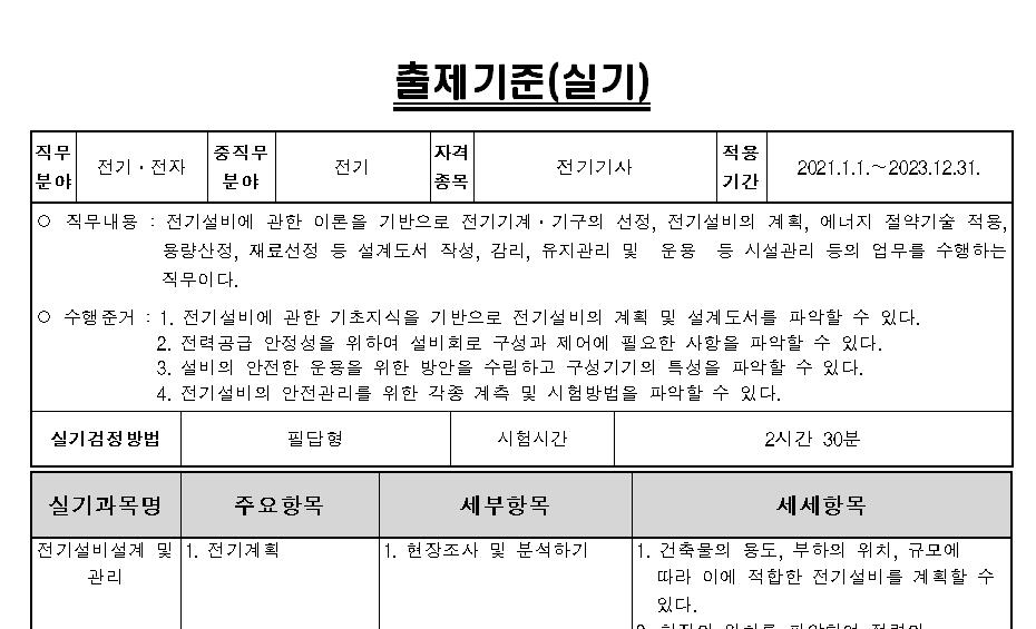 실기시험은 전기설비 설계 및 관리에 관하여 필답형으로 2시간 30분 동안 치게 됩니다.