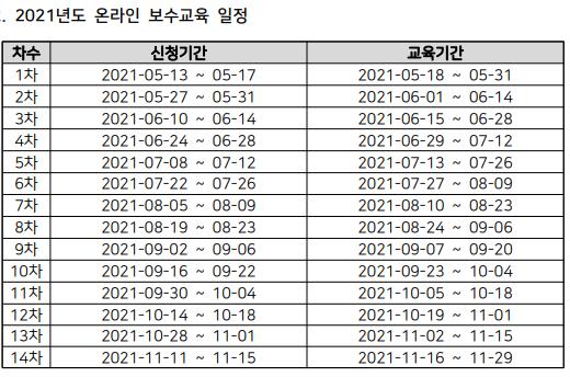 2021년도 온라인 보수교육일정입니다. 11월까지 신청을 받으며 총 14차시 까지 있습니다.