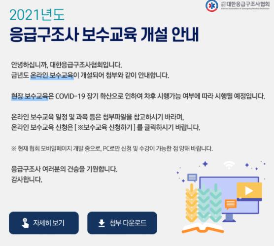 사단법인 대한응급구조사협회 홈페이지(www.emt.or.kr)에 가면 응급구조사 온라인 보수교육을 신청할수 있습니다.