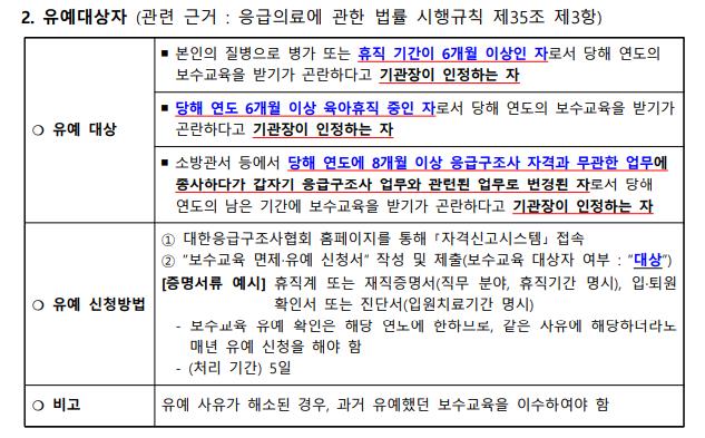 군복무중이거나 질병,병가,육아휴직 그리고 응급구조사 자격과 무관한 업무에 종사하는경우 온라인 보수교육을 면제,유예하거나 듣지 않아도 됩니다.