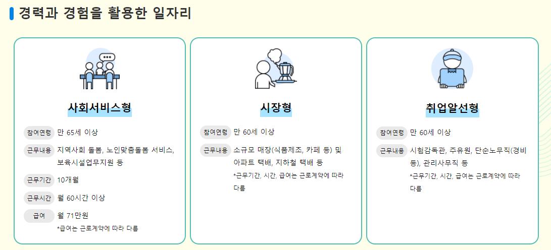 경력과 경험을 활용한 일자리로는 사회서비스형,시장형,취업알선형이 있습니다.