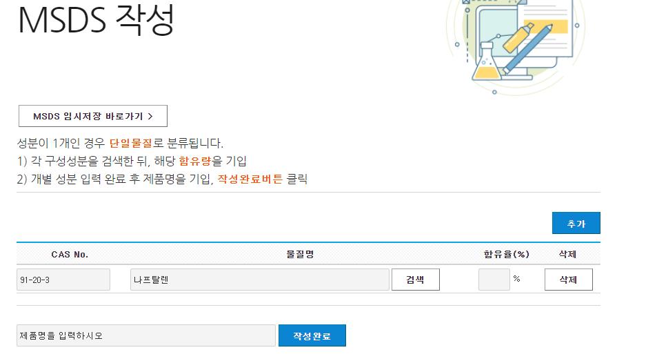 물질명과 함유율,CAS 번호와 제품명을 입력후 작성을 완료하면 나의 페이지에 MSDS물질안전보건자료가 저장됩니다.