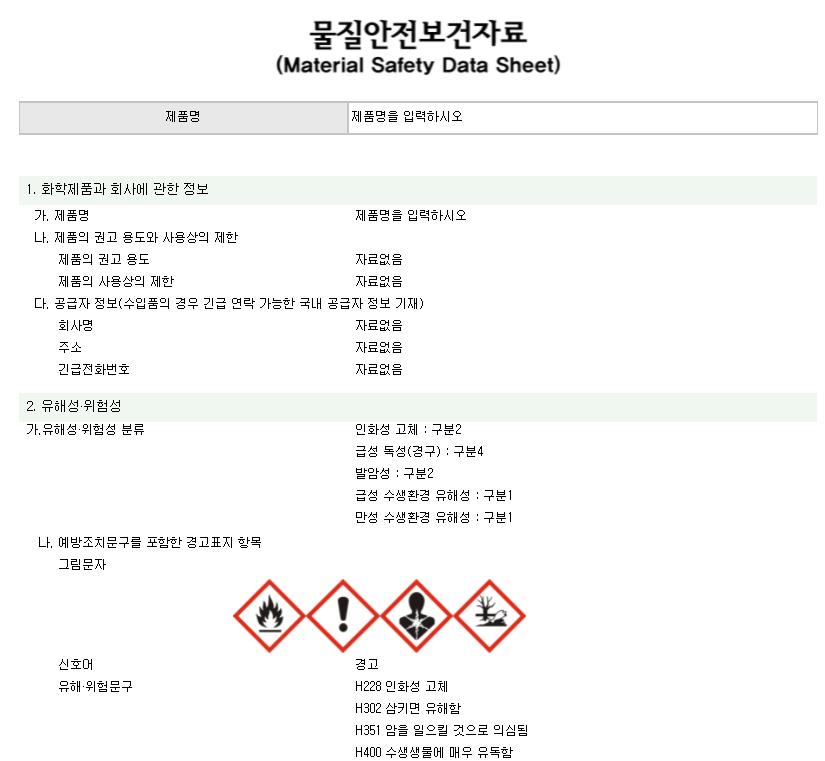 작성된 MSDS 자료를 다운받으면 위처럼 화학물질과 제품명에 대한 물질안전보건자료가 나타납니다.