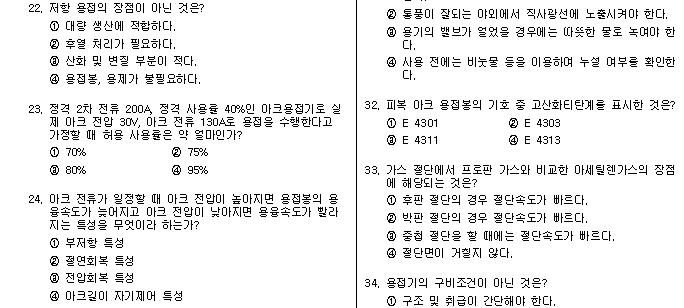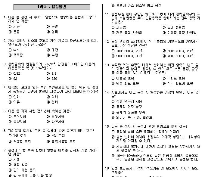 용접기능사 필기 기출문제는 CBT형태로 문제은행식으로 출제되어 2016년 부터는 기출문제를 공개하고 있지 않습니다.