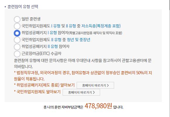 국민취업지원제도이거나 취업성공패키지, 근로장려금 수급자일경우에 따라 훈련 자비부담액이 달라집니다.