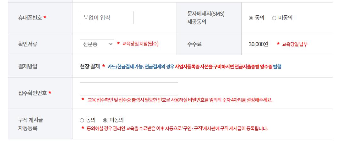 성명과 생년월일,보수교육일경우 수료번호,휴대폰번호,접수확인번호등을 입력한후 신청을 클릭하면 접수가 완료됩니다.