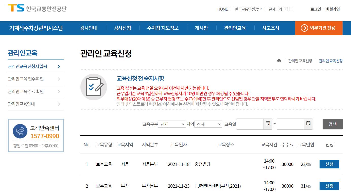 기계식주차장관리인교육은 TS한국교통안전공단에서 운영하는 기계식주차장관리시스템홈페이지(kotsa.or.kr/mpis)에서 신청 할수 있습니다.