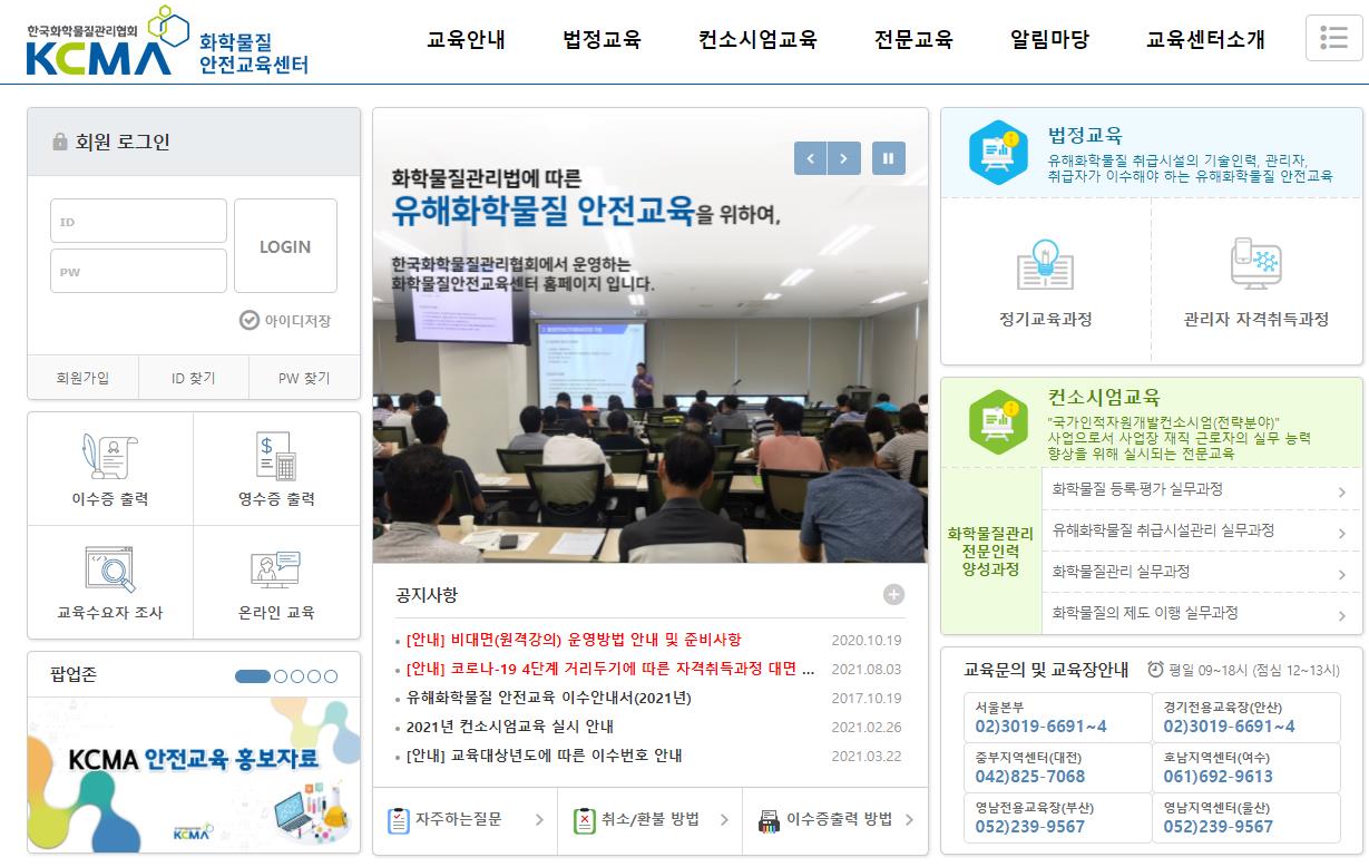 유해화학물질 법정교육에 관해서는 유해화학물질 안전교육홈페이지(edu.kcma.or.kr)에서 신청하고 확인하실수 있습니다.